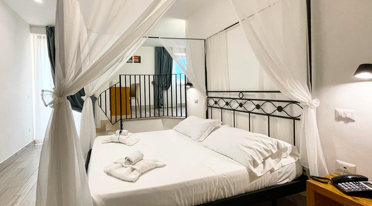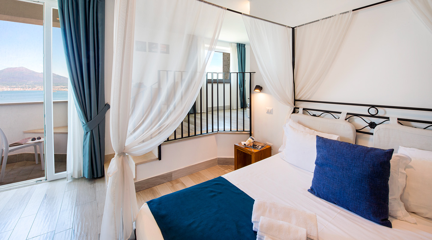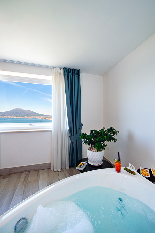 Our Junior Suite seamlessly combines elegance and historic charm with a canopy bed inspired  by the nearby medieval castle. The true centerpiece of this suite is the panoramic whirlpool tub,  offering an exclusive view of Mount Vesuvius. Luxurious fabric drapes and a spacious, elegantly  designed bathroom complete the experience, surrounding you with an atmosphere of intimacy  and sophistication.