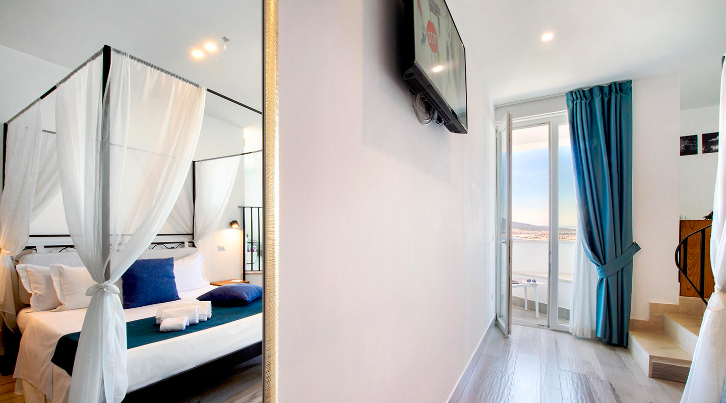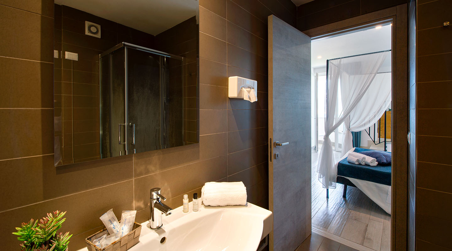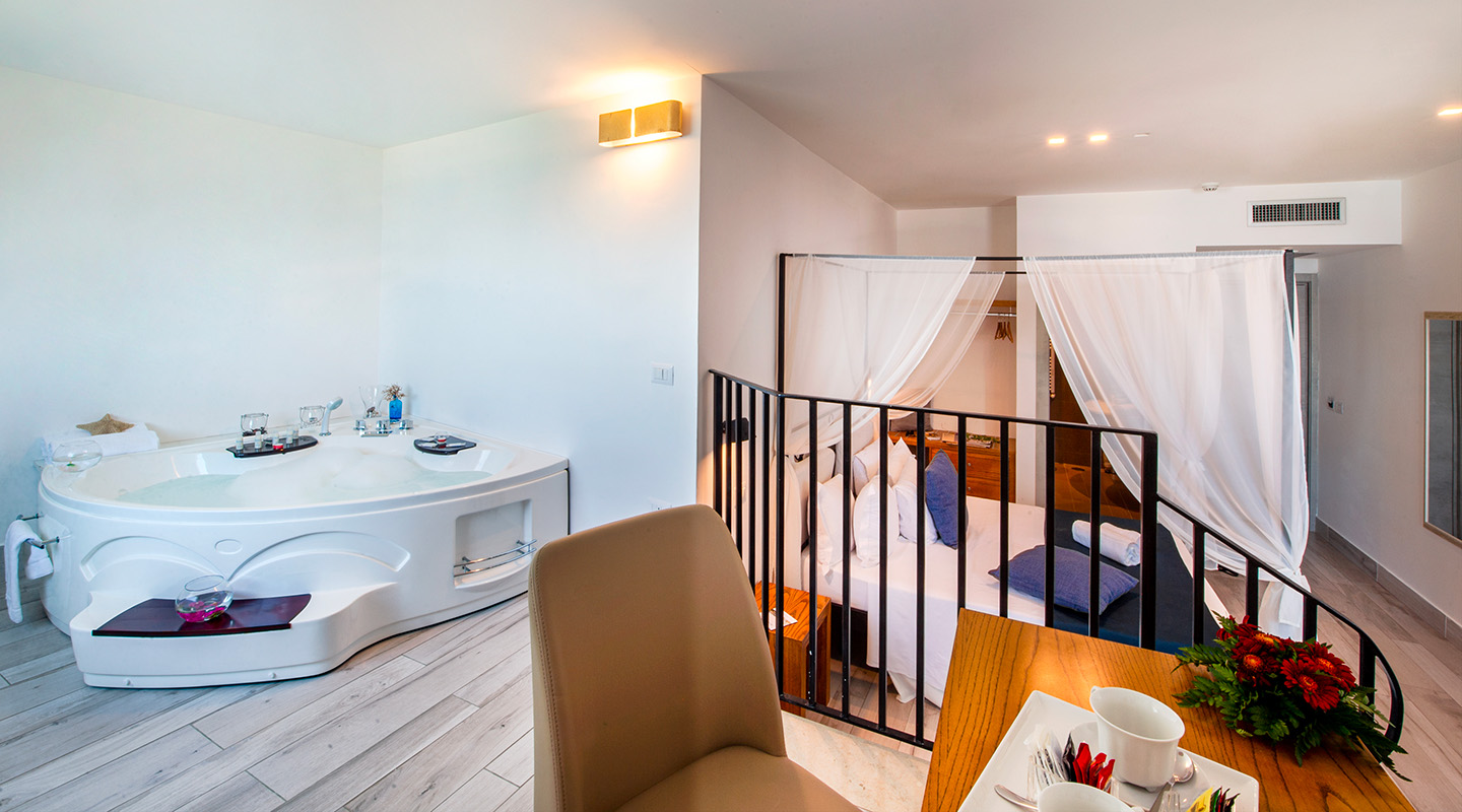 Our Junior Suite seamlessly combines elegance and historic charm with a canopy bed inspired  by the nearby medieval castle. The true centerpiece of this suite is the panoramic whirlpool tub,  offering an exclusive view of Mount Vesuvius. Luxurious fabric drapes and a spacious, elegantly  designed bathroom complete the experience, surrounding you with an atmosphere of intimacy  and sophistication.