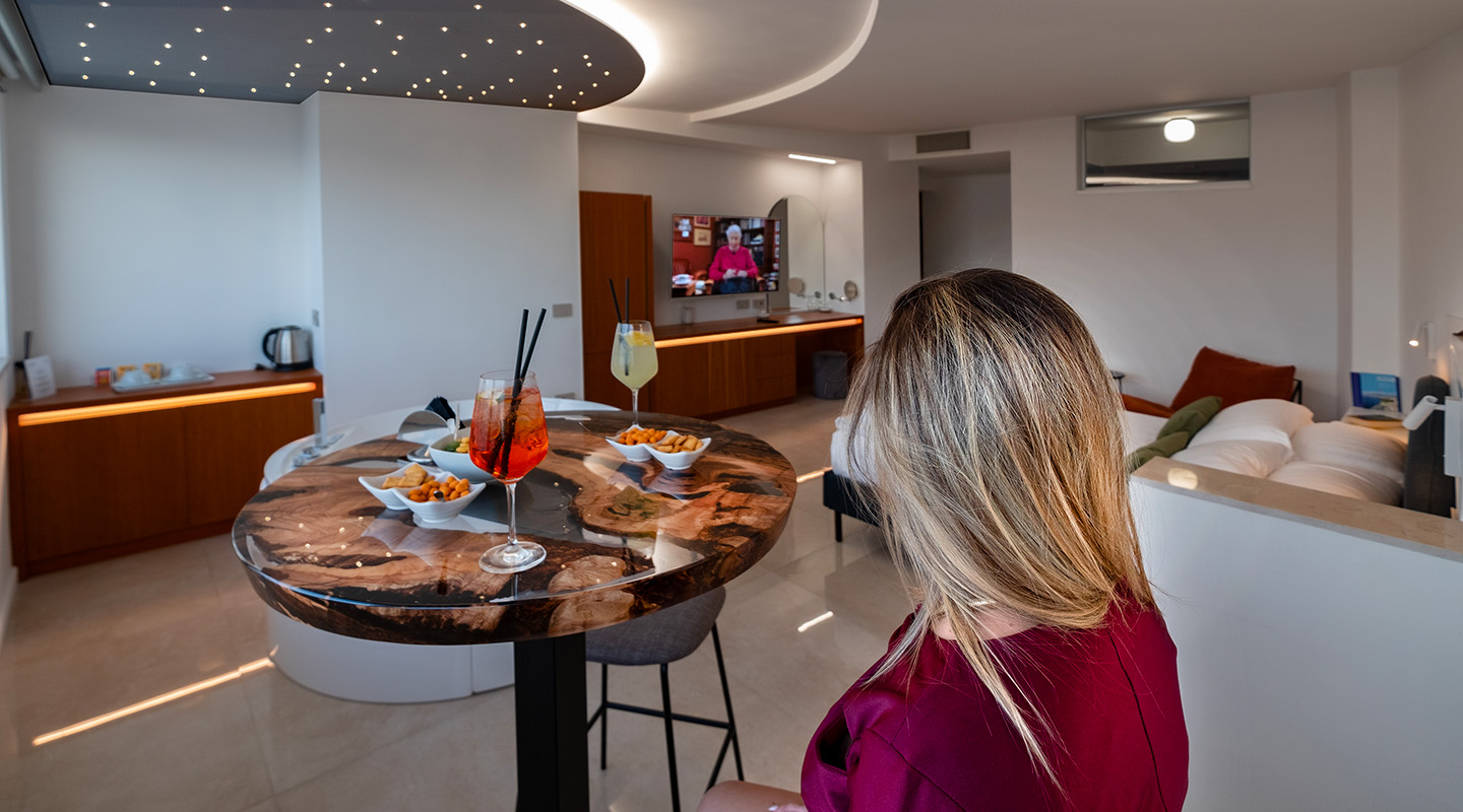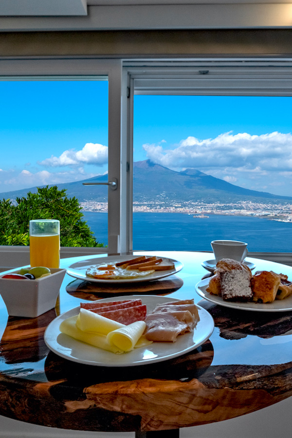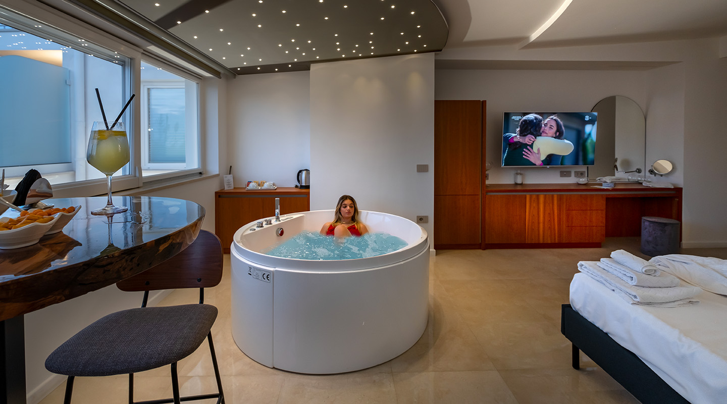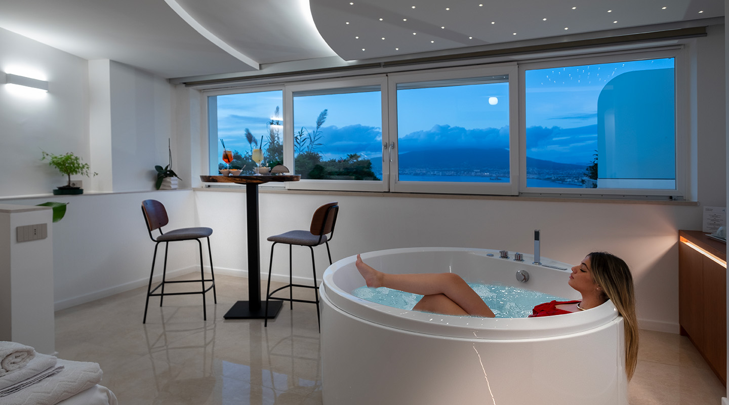 Discover our exclusive suite, a haven of luxury where every detail is designed for absolute well being. Featuring a designer whirlpool tub and an unforgettable view of Mount Vesuvius, the suite is adorned with exquisite marble such as onyx and Trani stone.