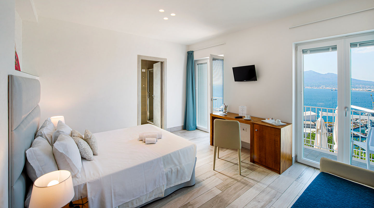 Spacious and filled with natural light, these rooms open onto private balconies overlooking  Mount Vesuvius, the Gulf of Naples, and stretching as far as the islands of Procida and Ischia.  Every day, wake up to an unparalleled panorama that takes your breath away.